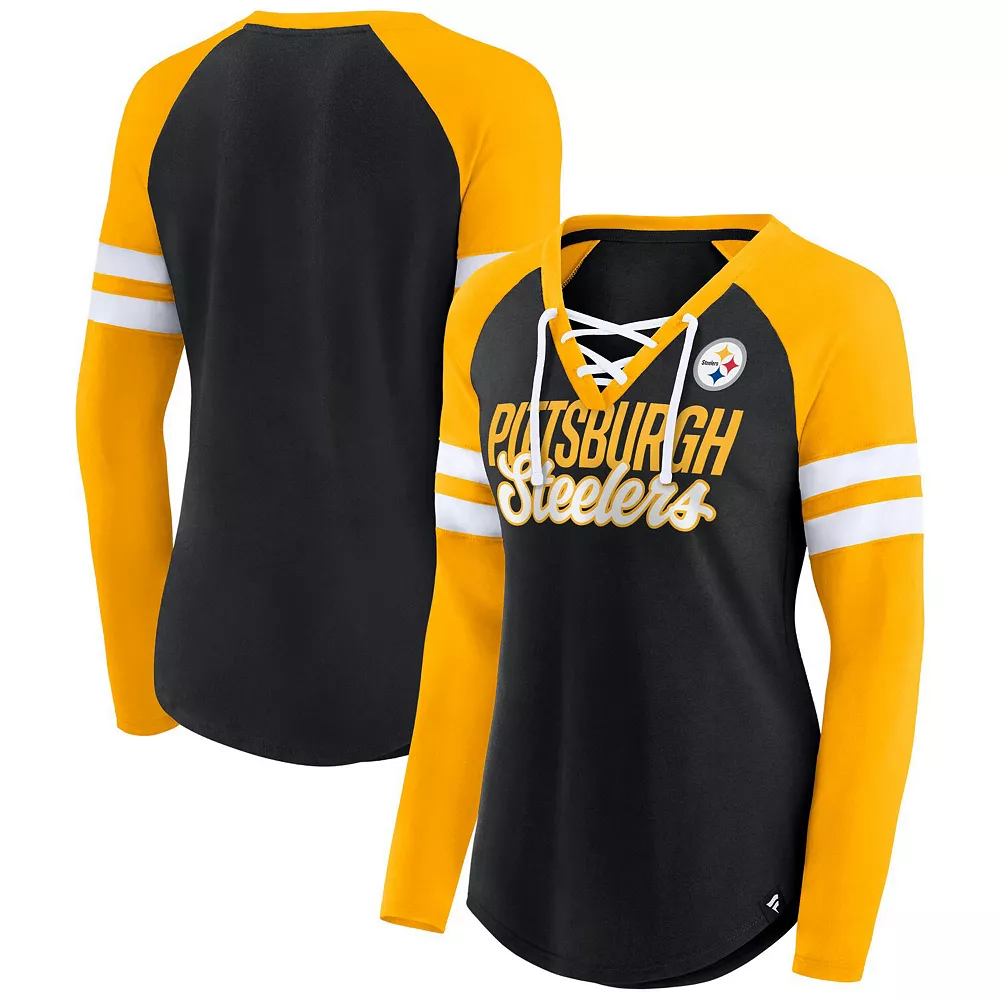 Wear your favorite team’s colors loud and proud with this Pittsburgh Steelers True to Form T-shirt from Fanatics Branded. It features a sporty lace-up V-neckline and Pittsburgh Steelers graphics accentuated by the contrasting stripes. Plus, raglan sleeves provide a little extra arm room for better movement.