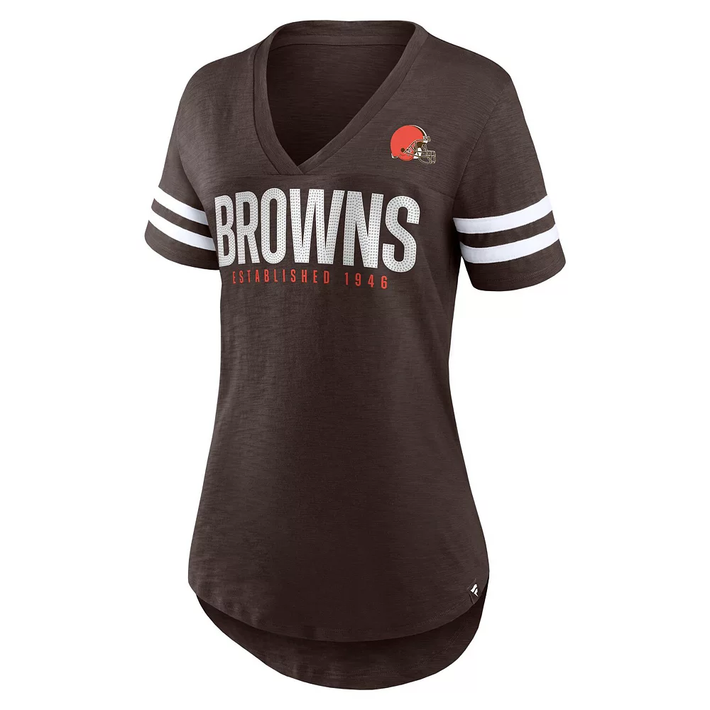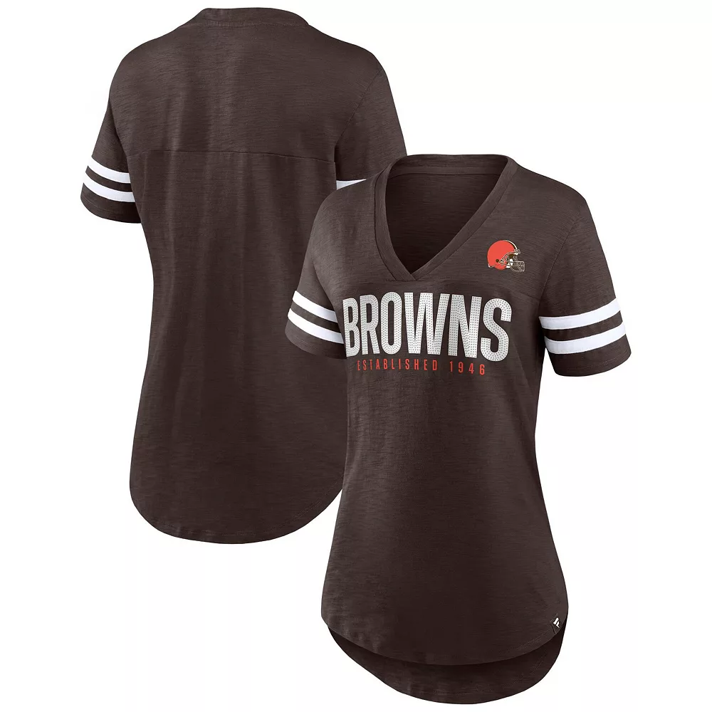 Take your game day style up a notch with this Cleveland Browns Speed Tested T-shirt from Fanatics Branded. It features a flattering V-neckline and noticeable Cleveland Browns graphics accentuated by the sleeve stripes. The longer, rounded hem also creates a more comfortable fit and feel.