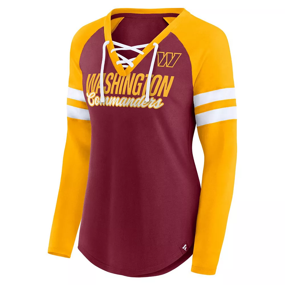 Wear your favorite team’s colors loud and proud with this Washington Commanders True to Form T-shirt from Fanatics Branded. It features a sporty lace-up V-neckline and Washington Commanders graphics accentuated by the contrasting stripes. Plus, raglan sleeves provide a little extra arm room for better movement.
