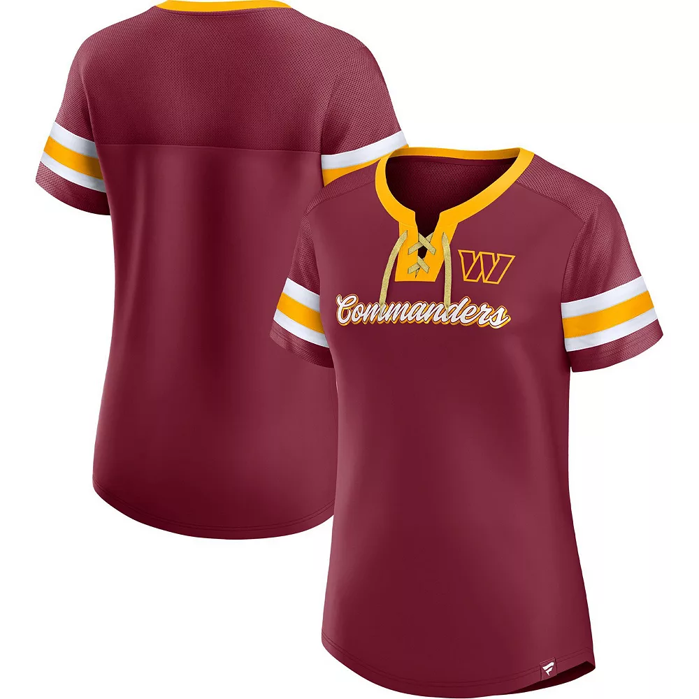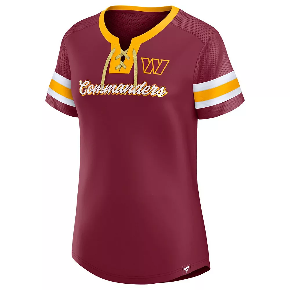 Gear up in Washington Commanders style with this Original State T-shirt. It features a unique lace-up neck and sewn-on stripes for added detail. The sleek team graphics across the front make this Fanatics Branded tee a must-have for any Washington Commanders game.