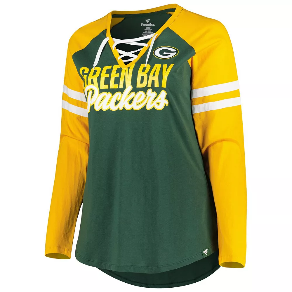Wear your favorite team’s colors boldly with this Green Bay Packers True to Form V-neck T-shirt from Fanatics Branded. Its two-tone design features printed Green Bay Packers graphics accentuated by the lace-up neckline and sleeve stripes. Plus, the raglan sleeves create some extra room for more flexible movement.