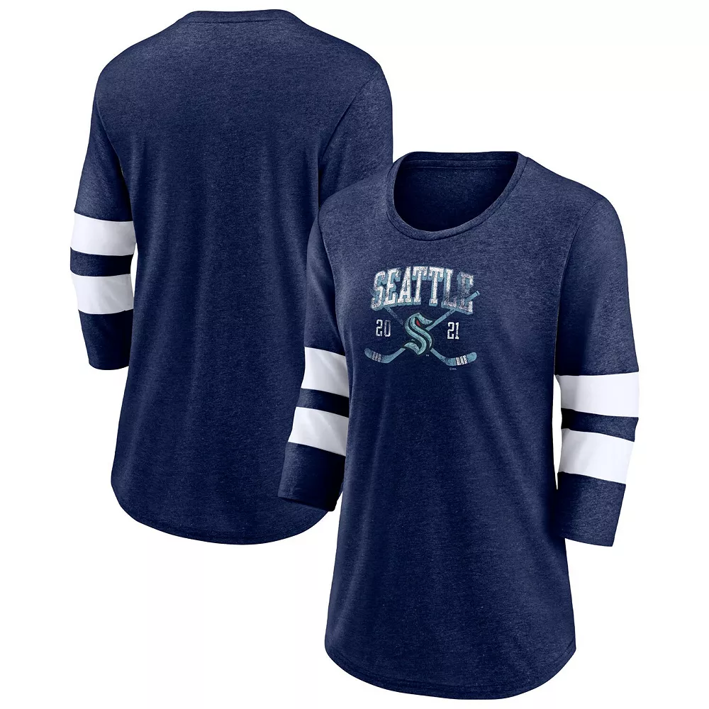 Put eyes on your Seattle Kraken pride with this Fanatics Branded Line Shift T-shirt. It features three-quarter sleeves and distressed Seattle Kraken graphics for a distinct look. In addition, tri-blend fabric offers added appeal and softness.
