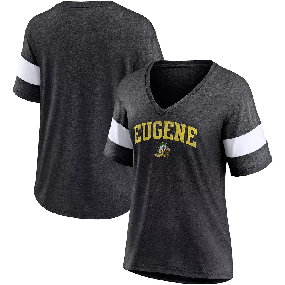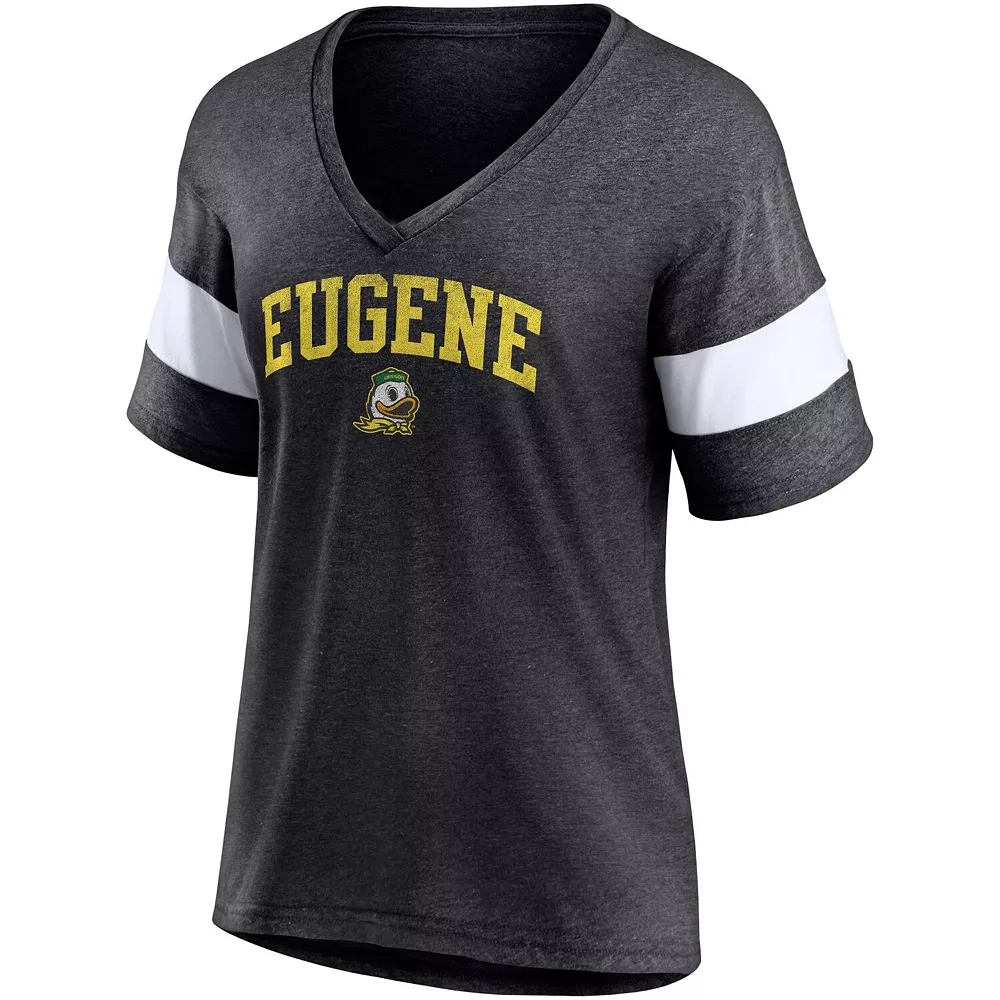 Represent the hometown of your Oregon Ducks in this Arched City V-neck T-shirt from Fanatics Branded. It features Oregon Ducks graphics printed in a distressed design that’s highlighted by the contrasting sleeve stripes. Tri-blend material also feels super soft, and the rounded hem creates a more comfortable fit.