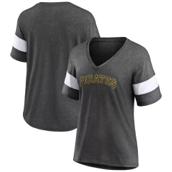 Grab a look that fully showcases your Pittsburgh Pirates spirit with this Wordmark T-shirt from Fanatics Branded. It’s crafted from super-soft tri-blend material that gives it a textured heathered look. Bold Pittsburgh Pirates graphics and a contrasting sleeve stripe finish the design, while the V-neckline provides a comfortable fit.