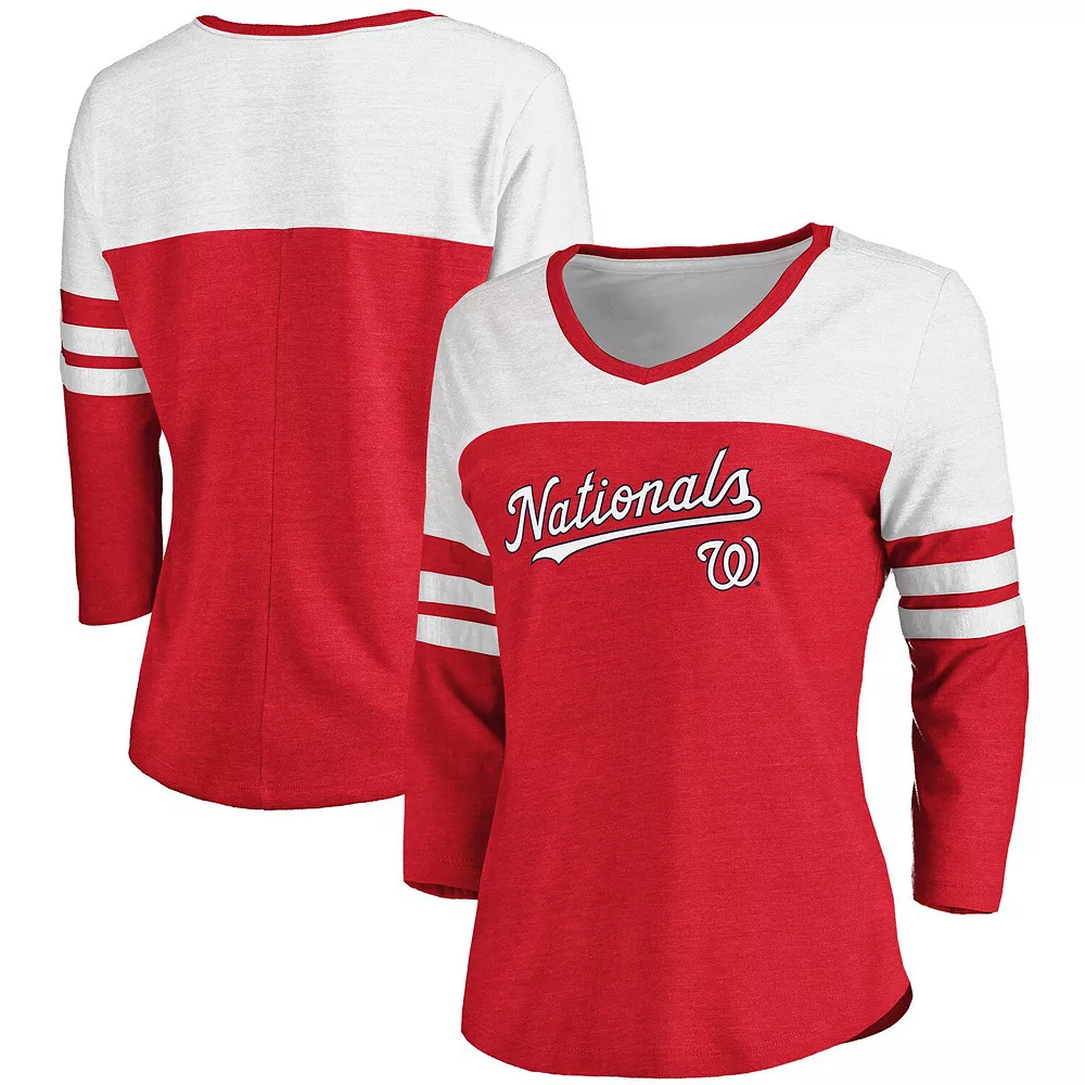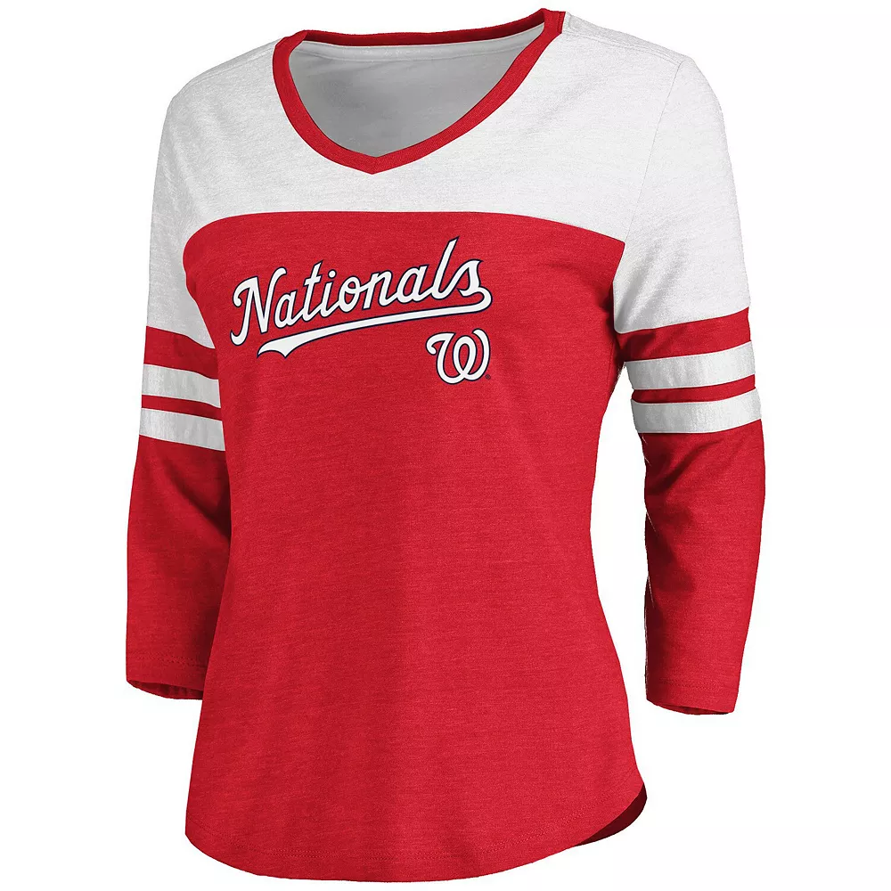 Get ready to show off your unwavering Washington Nationals pride with this Fanatics Branded Official Wordmark 3/4 Sleeve V-neck T-shirt. The crisp Washington Nationals graphics across the chest will let everyone know who you’re rooting for and its eye-capturing V-neck and contrast-color inserts on the sleeves will always offer the ideal combination of appeal and comfort. Pair this stylish top with your favorite cap for the ultimate game day look!