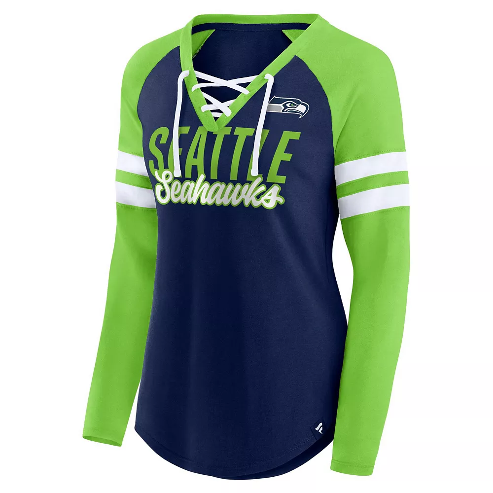 Wear your favorite team’s colors boldly with this Seattle Seahawks True to Form V-neck T-shirt from Fanatics Branded. Its two-tone design features printed Seattle Seahawks graphics accentuated by the lace-up neckline and sleeve stripes. Plus, the raglan sleeves create some extra room for more flexible movement.