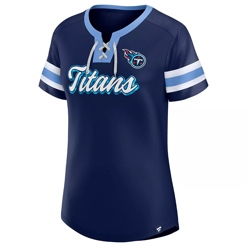 Elevate your style on game day by sporting this Tennessee Titans Original State T-shirt from Fanatics Branded. It features a chic lace-up neckline and sleeve stripes that coordinate with the team’s name across the front. Mesh fabric also gives this Tennessee Titans tee a breathable feel for more comfortable wearing during warmer weather.