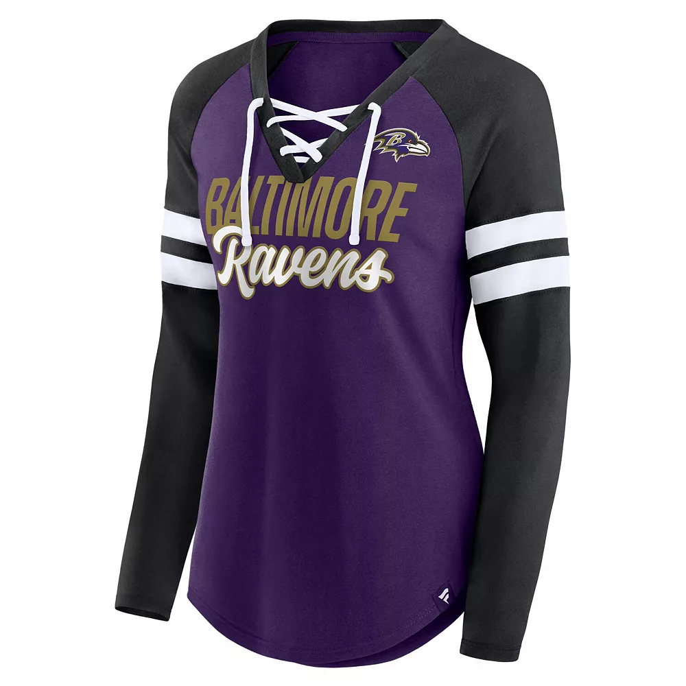 Wear your favorite team’s colors boldly with this Baltimore Ravens True to Form V-neck T-shirt from Fanatics Branded. Its two-tone design features printed Baltimore Ravens graphics accentuated by the lace-up neckline and sleeve stripes. Plus, the raglan sleeves create some extra room for more flexible movement.