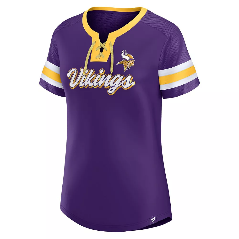 Elevate your style on game day by sporting this Minnesota Vikings Original State T-shirt from Fanatics Branded. It features a chic lace-up neckline and sleeve stripes that coordinate with the team’s name across the front. Mesh fabric also gives this Minnesota Vikings tee a breathable feel for more comfortable wearing during warmer weather.
