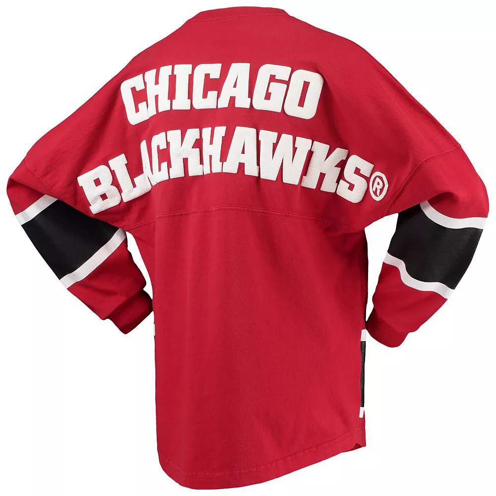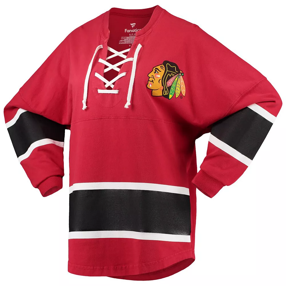 This Chicago Blackhawks Jersey T-shirt by Fanatics Branded gives your team gear a charming touch. It features a flattering lace-up neckline and puffy Chicago Blackhawks graphics for a fan-forward look. In addition, the cotton fabric provides maximum softness for a stylish and comfy game day outfit.