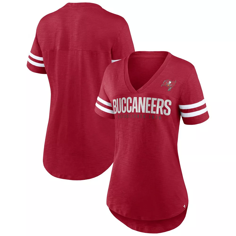 Take your game day style up a notch with this Tampa Bay Buccaneers Speed Tested T-shirt from Fanatics Branded. It features a flattering V-neckline and noticeable Tampa Bay Buccaneers graphics accentuated by the sleeve stripes. The longer, rounded hem also creates a more comfortable fit and feel.