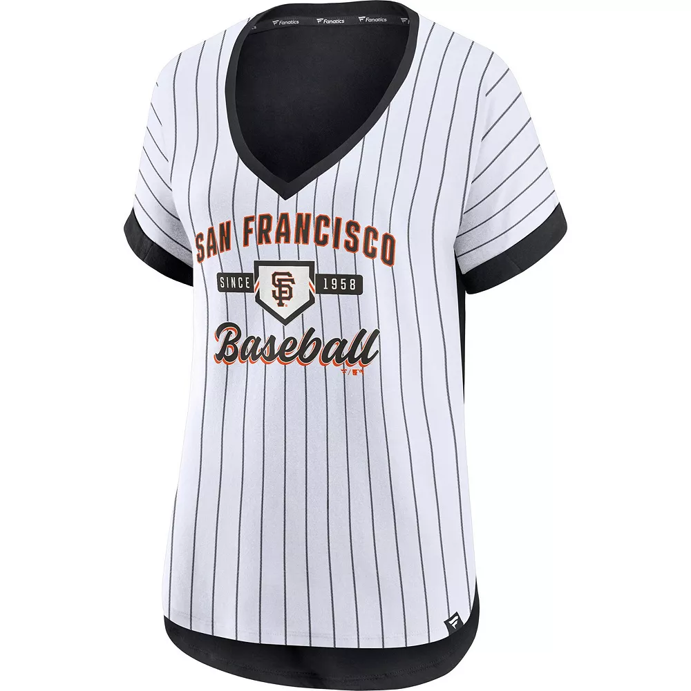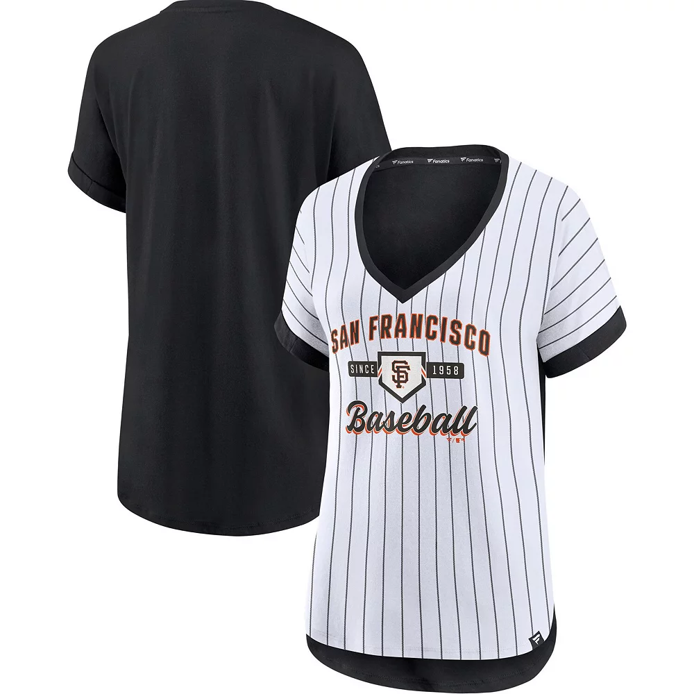 Create a fun, team-inspired look for the ballpark with this San Francisco Giants Iconic Noise Factor Pinstripe V-neck T-shirt from Fanatics Branded. It features a two-tone design with pinstripes down the front that accentuate the San Francisco Giants graphics on the chest. This game day tee also features a rounded hem with a droptail for proper coverage as you rep your crew.