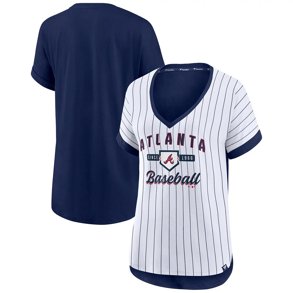 Create a fun, team-inspired look for the ballpark with this Atlanta Braves Iconic Noise Factor Pinstripe V-neck T-shirt from Fanatics Branded. It features a two-tone design with pinstripes down the front that accentuate the Atlanta Braves graphics on the chest. This game day tee also features a rounded hem with a droptail for proper coverage as you rep your crew.